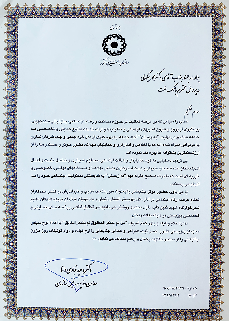 رییس سازمان بهزیستی با اهدای لوح سپاس این سازمان، حسن نیت، همراهی و همدلی مدیرعامل بانک ملت را ارج نهاده و دوام توفیقات روزافزون وی را از محضر خداوند متعال خواستار شده است.